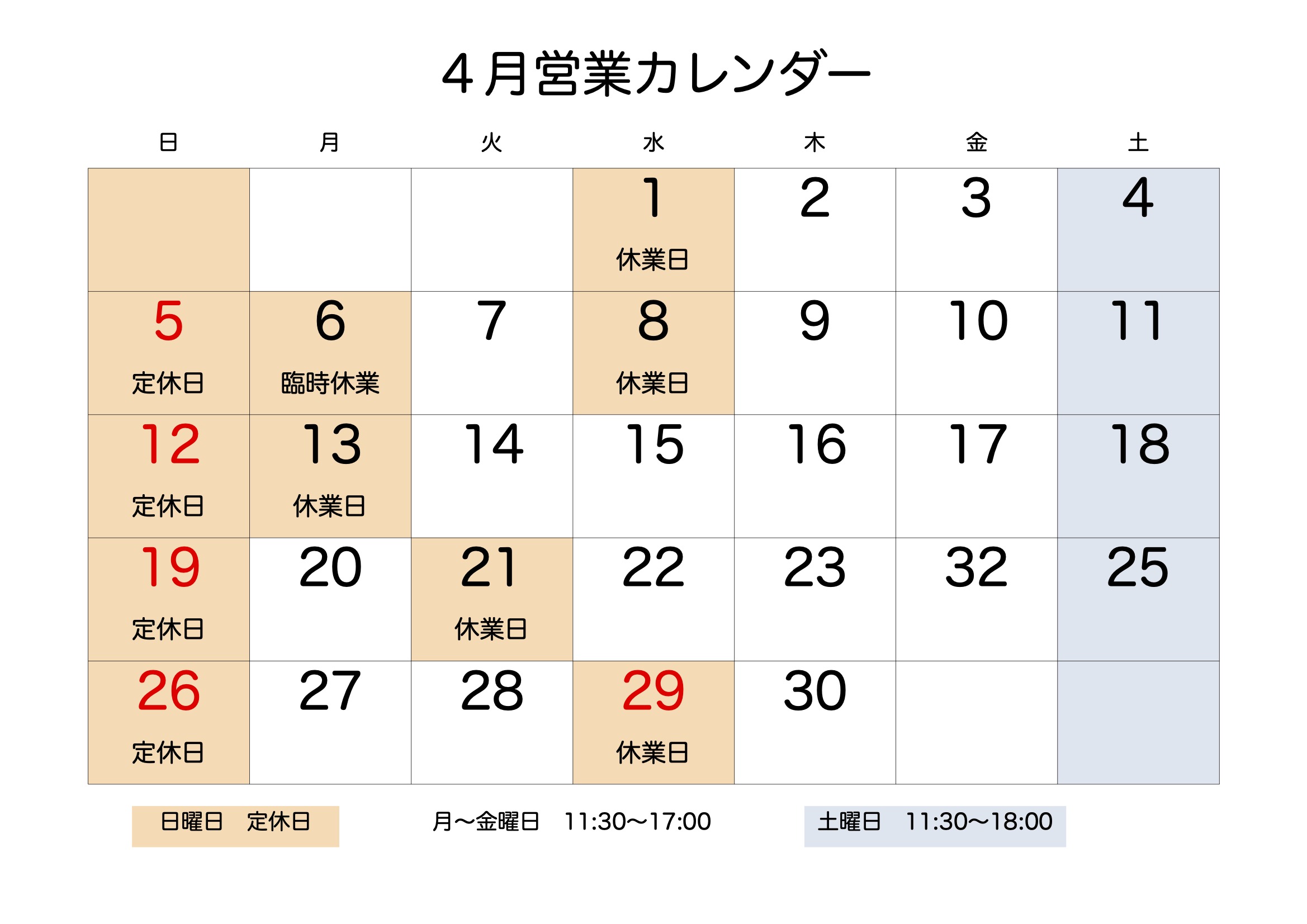 2026年4月から、都合により営業時間を変更いたします 平日 11:30〜17:00土曜・祝日 11:30〜18:00 日曜定休4月6日(月)・8日(水)・13日(月)・21日(火)・29日(水) 臨時休業いたします